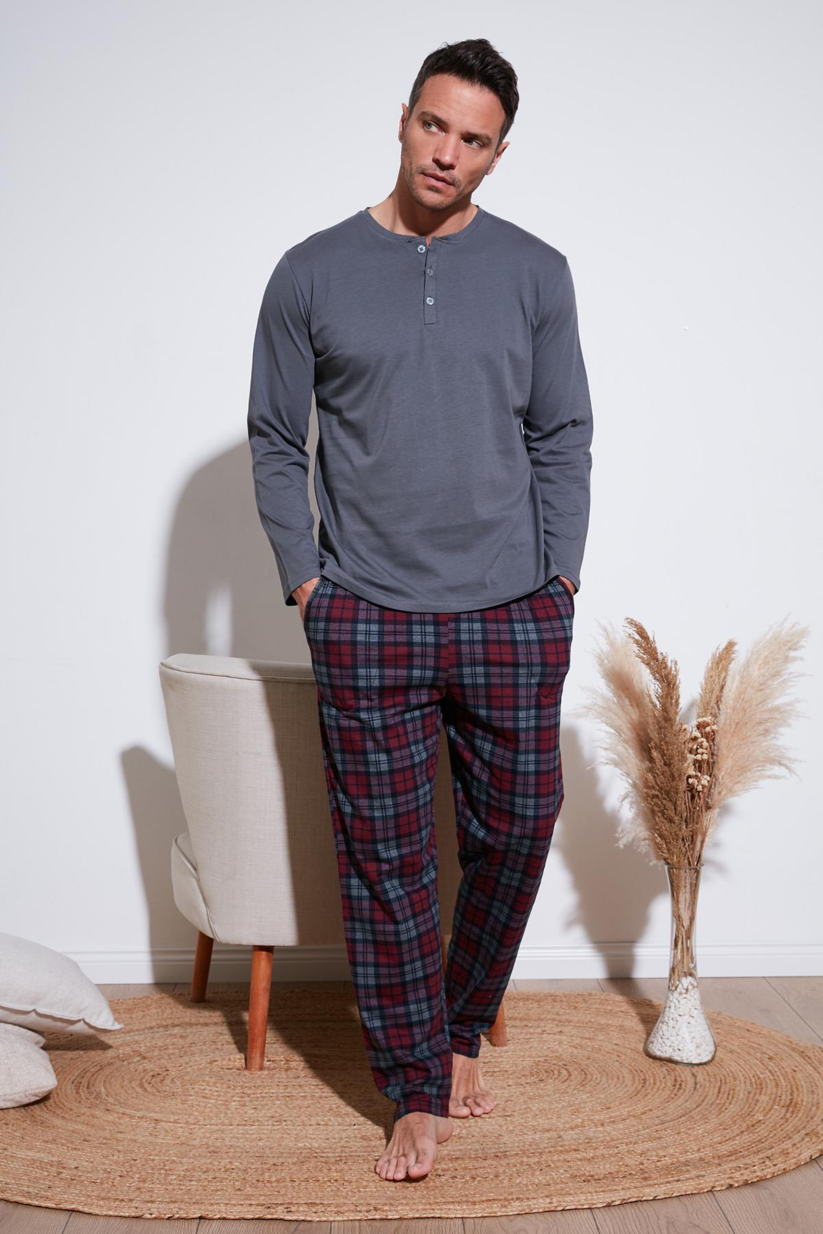 Buratti Ekoseli Pamuklu Beli Lastikli Regular Fit Uzun Kollu Erkek Pijama Takımı 6572003 FÜME