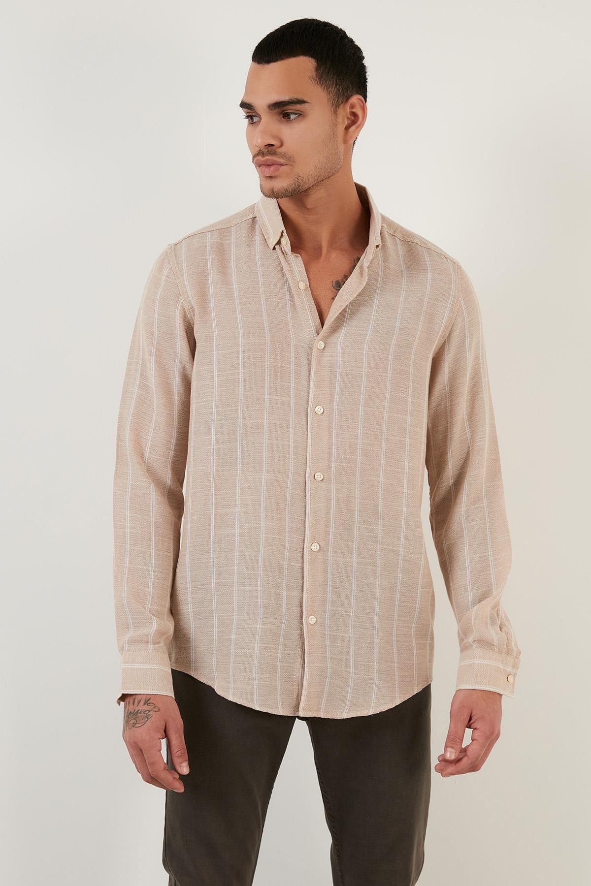 Buratti Pamuklu Çizgili Regular Fit Düğmeli Yaka Erkek Gömlek CF21S112480 Taş-Beyaz